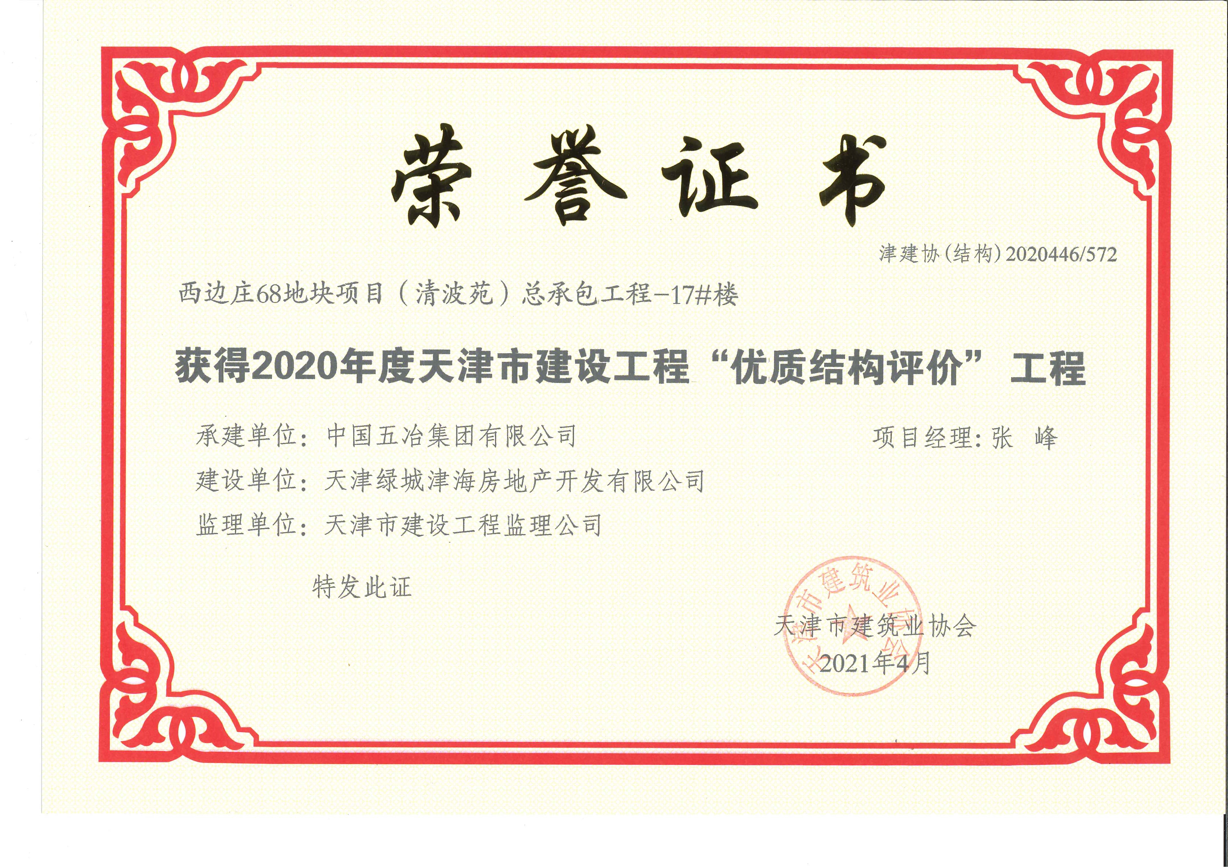 天津靜海綠城(西邊莊68地塊項目-清波苑總承包工程-17號樓)--2020年天津優(yōu)質(zhì)結(jié)構(gòu)評價