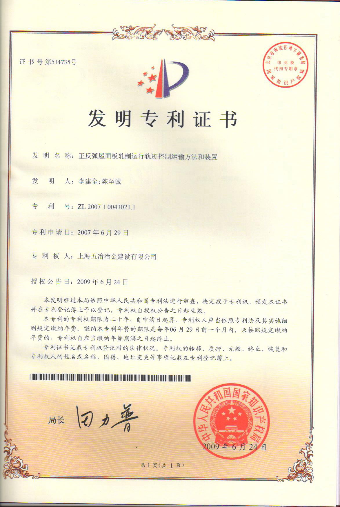 正反弧屋面板軋制運行軌跡控制運輸方法和裝置 ZL 200710043021.1