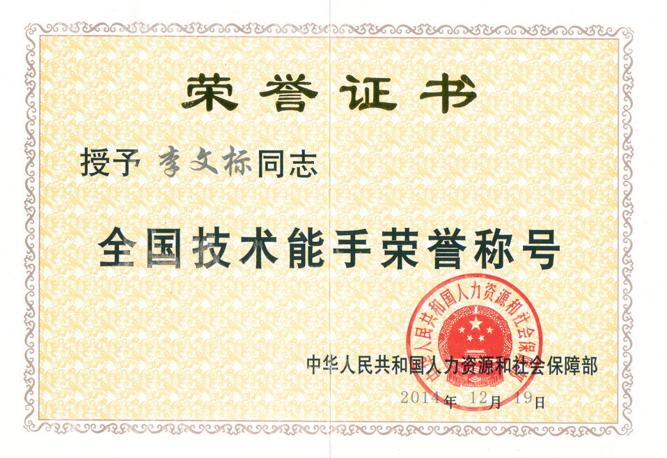 ????? 2014年12月19日,李文標(biāo)同志榮獲國(guó)家人力資源社會(huì)保障部“全國(guó)技術(shù)能手”稱(chēng)號(hào)。