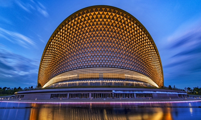 公園核心主舞臺(tái)雙面劇場(chǎng)建筑,形似鳳凰展翅,集空間桁架與拱支雙曲拋物面索網(wǎng)兩獨(dú)立復(fù)雜結(jié)構(gòu)為一體,擁有超萬平方米的可投影天幕,是世界最大的全景聲天幕,可滿足5千到4.7萬人不同規(guī)模觀演需求;主舞臺(tái)幕墻呈“鳳羽”肌理特征,由 1734 塊節(jié)點(diǎn)不共面異形四棱錐鋁板構(gòu)成,形成曲線流暢、肌理鮮明、光影豐富的立面效果。