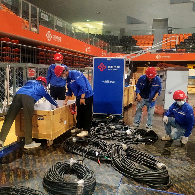 聞令而動(dòng),項(xiàng)目負(fù)責(zé)人張磊立即組織起11位專業(yè)技術(shù)管理人員成立黨員志愿服務(wù)隊(duì),第一時(shí)間加入戰(zhàn)斗。讓占地3500平米的體育館“變身”檢測(cè)中心,電路改造疏通是關(guān)鍵工序。憑借機(jī)電專業(yè)的“看家本領(lǐng)”,項(xiàng)目團(tuán)隊(duì)快速摸清了場內(nèi)電力現(xiàn)狀,制定出經(jīng)濟(jì)高效的改造方案,并依托五冶總部應(yīng)急指揮體系緊急協(xié)調(diào)周邊兄弟項(xiàng)目調(diào)配所需材料,全員有條不紊,穿插作業(yè),于當(dāng)晚22點(diǎn)就完成了電力改造,為實(shí)驗(yàn)室搭起由150米主線、數(shù)百米分線組成的“電力血管”。隨后,五冶黨員志愿服務(wù)隊(duì)又與現(xiàn)場各方建設(shè)者合力完成了占地1000多平米的核酸檢測(cè)氣膜方艙實(shí)驗(yàn)室搭設(shè),并完成內(nèi)部電路疏通及檢測(cè)設(shè)備安裝工作,保障艙內(nèi)100多臺(tái)設(shè)備電力充足,場館臨時(shí)用電暢通。